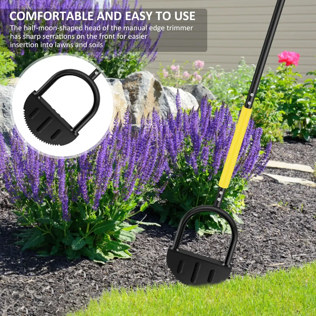 ✅Eco-Friendly & Efficient: The manual edger half-moon-shaped head has sharp serrations at the front end, which concentrates the force on the tip, making it easier to insert into the lawn and soil, saving energy and speeding up work efficiency.