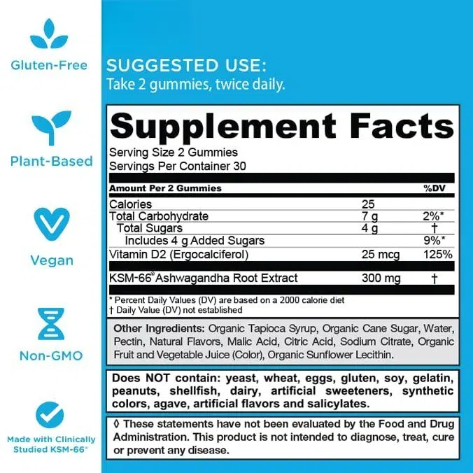 Non-GMO. Vegan & Sugar Free Ashwagandha Gummies - Each ashwagandha gummy is packed with 300mg of Ashwagandha Root and Vitamin D to support your immune system.