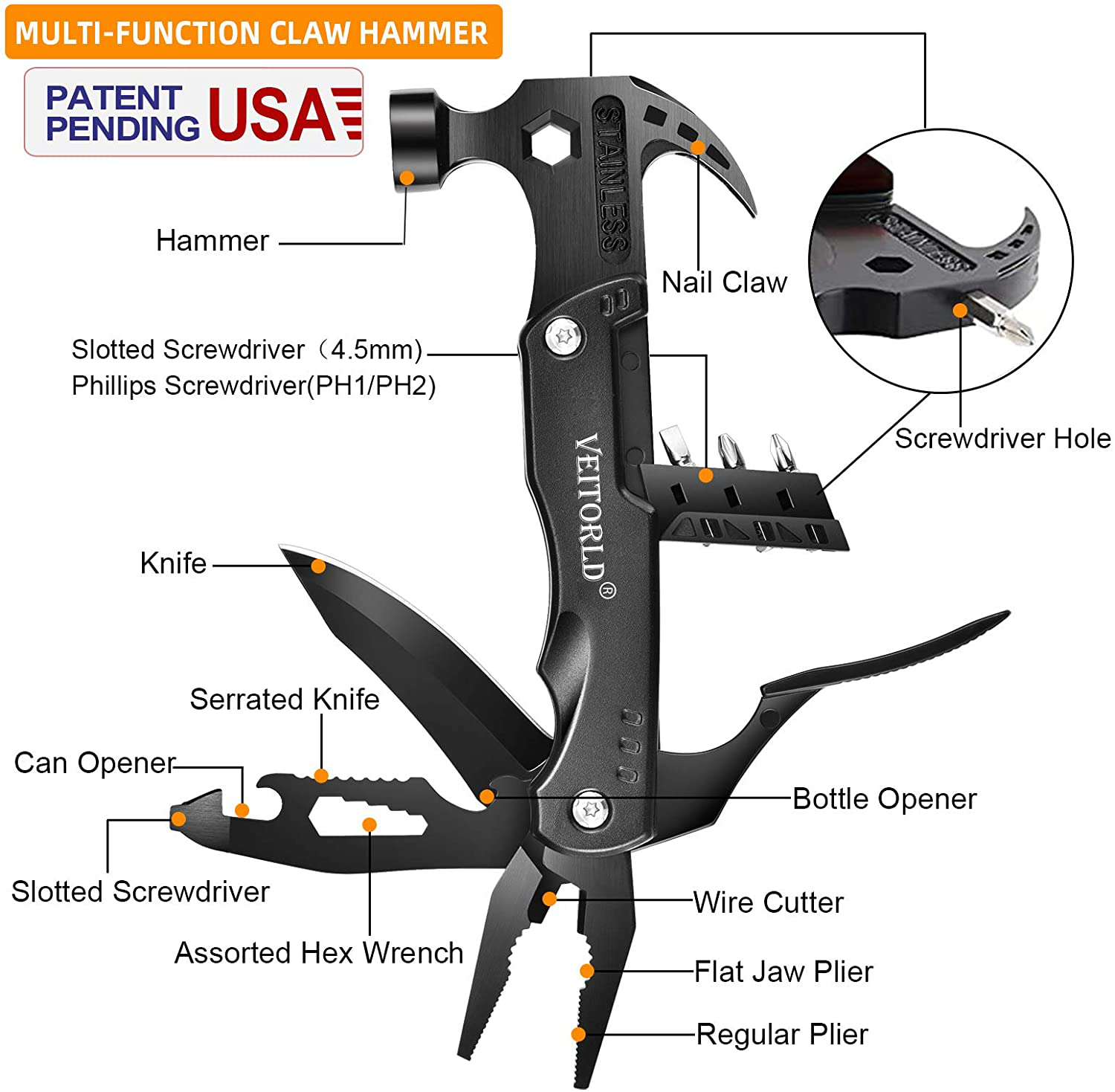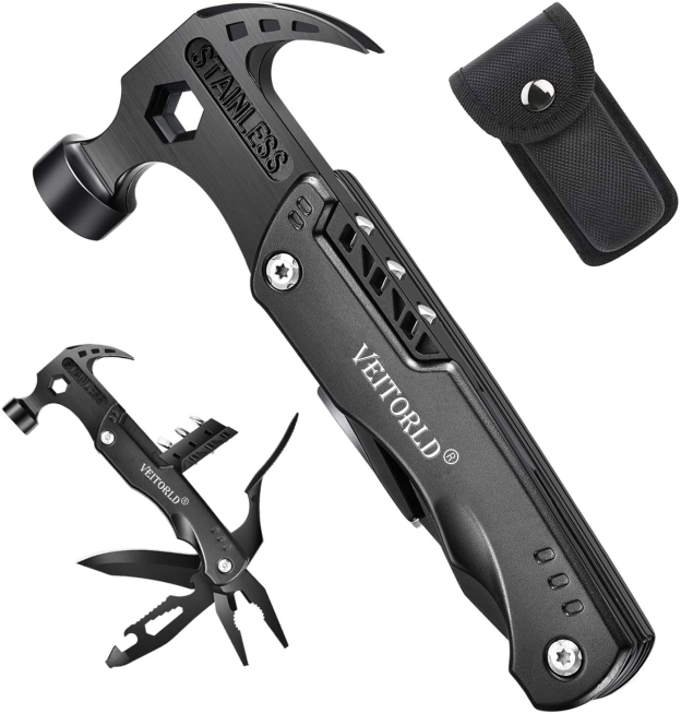 More than A Hammer - Our 14-in-1 multitool includes compact hammers, pliers, different types of screwdrivers, sharp knives, nail claws, wire cutters, can openers, bottle openers, etc.