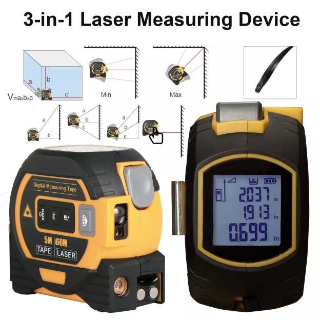 3in1intelligent digital laser rangefinder has 60m laser ranging, 5m self-locking measuring tape, and laser cross-marking capabilities. Thanks to new developments, the increase in memory and processing capacity of the chips, gives opportunity to offer all these features together. All-in-one tool!