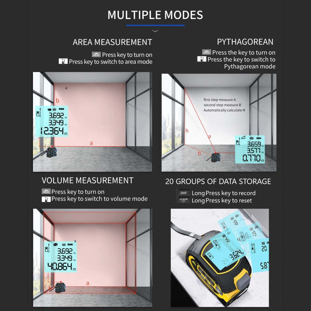 The laser meter has various kinds of measurement functions including single/continuous measurement, area measurement, volumes measurement, and pythagorean measurement. Also has tape measure and laser marking. LCD display with backlight, clear definition, you can see the measurement data clearly even in the dim-light environment.