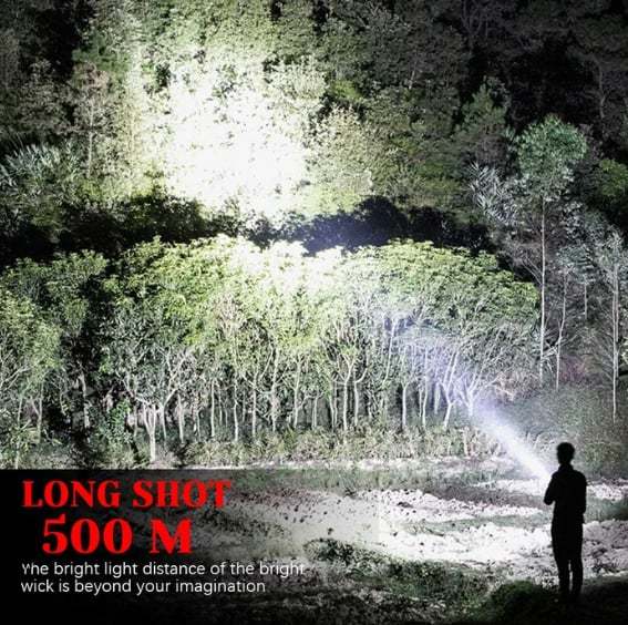 This is a 90000 lumens LED Spotlight flashlight, which adopts XHP series lamp beads to provide super bright light, and the beam distance exceeds 400 meters.Light up your way forward.