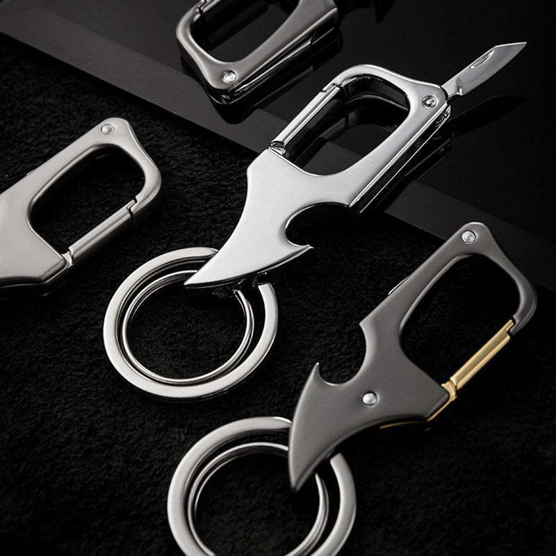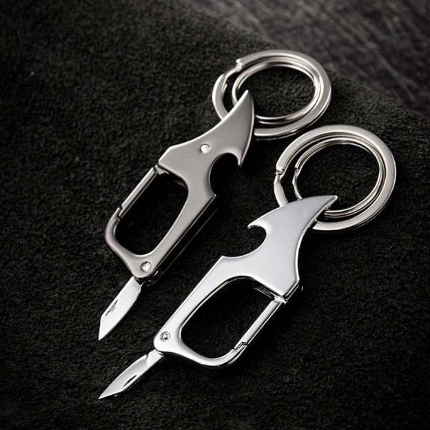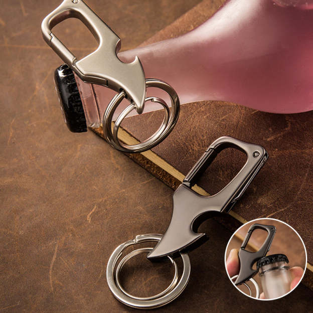 With this versatile charm keychain, you'll never have to be without a bottle opener or pocket knife again. Crafted from high quality metal, this double ring keychain features a convenient bottle opener, hidden pocket knife and stylish charm design. Whether you're at a party, camping, or simply need a quick tool on the go, this keychain is the perfect solution for opening your favorite drink and completing small tasks.