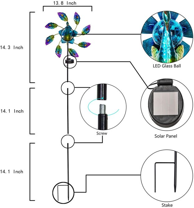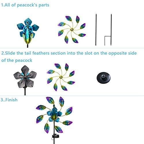 Decorate your garden with peacock feathers, colorful and beautiful wind spinners along with windmill rotation function after charging energy with direct sunlight.